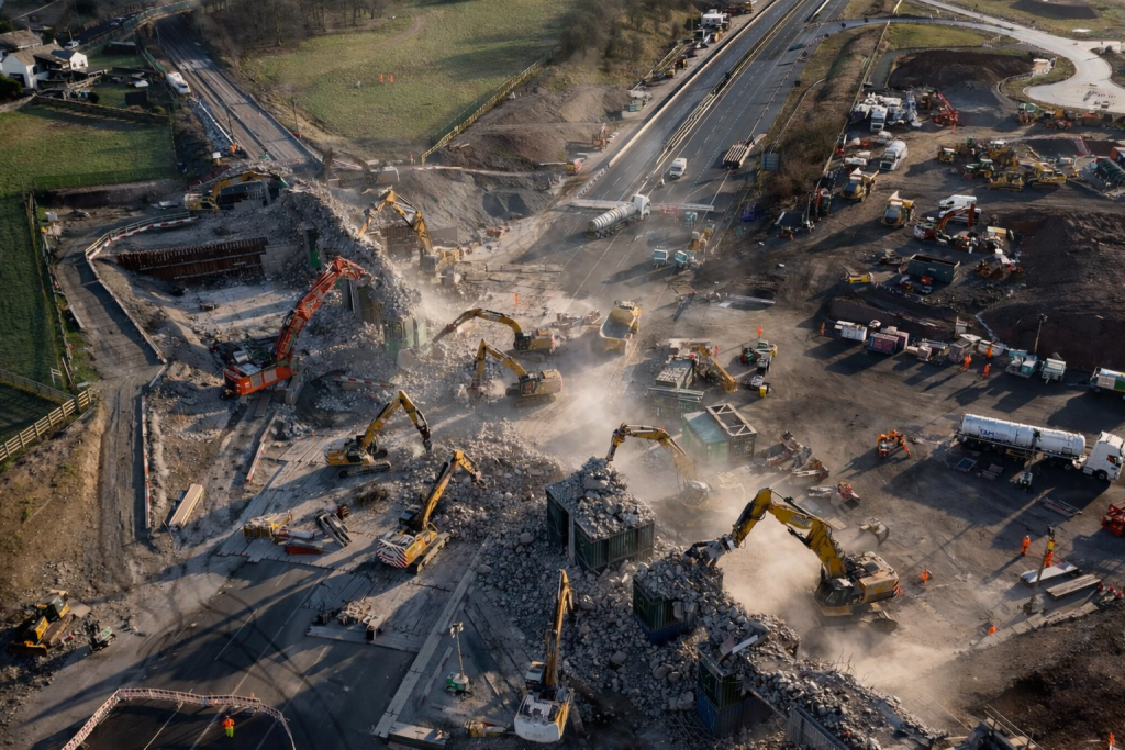 A fleet of some of the UK’s largest excavators was deployed to break down the 1960s concrete structure, which had spanned six lanes of motorway for almost 60 years. After dominating the skyline above the M6 for decades, the bridge was reduced to rubble in a matter of hours, watched by hundreds of spectators over the weekend.