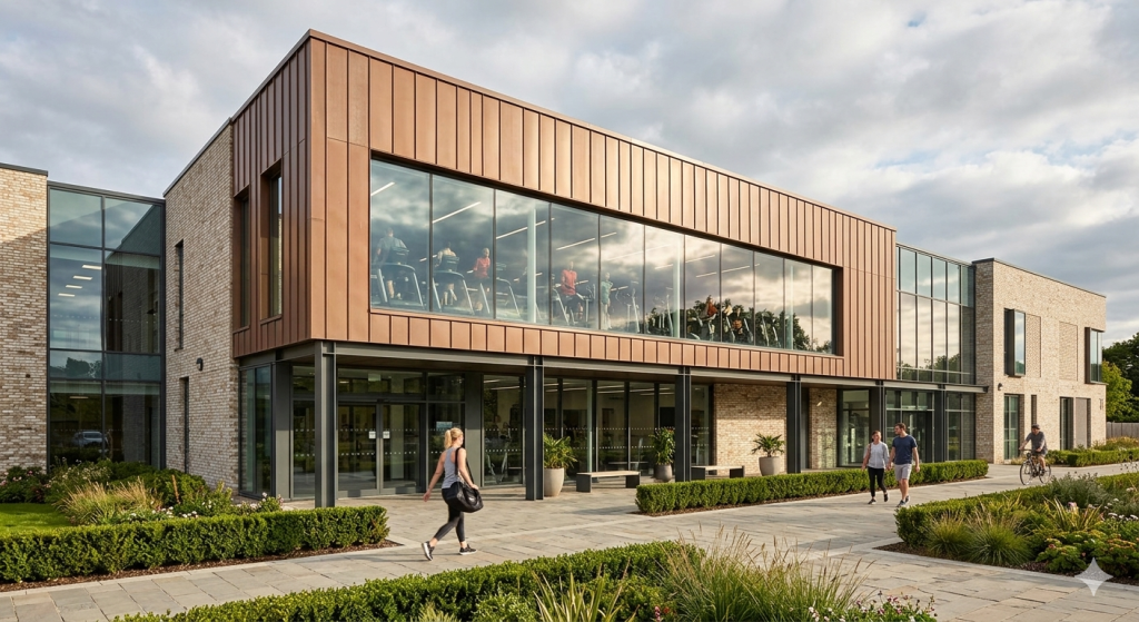 At the heart of the development is a new indoor leisure facility featuring a 53-station gym, group fitness studios, soft play areas, party rooms and a café. The scheme also includes refurbishment of the former Speedwell Building to provide office space, community facilities and a new outreach base for Hartpury University.